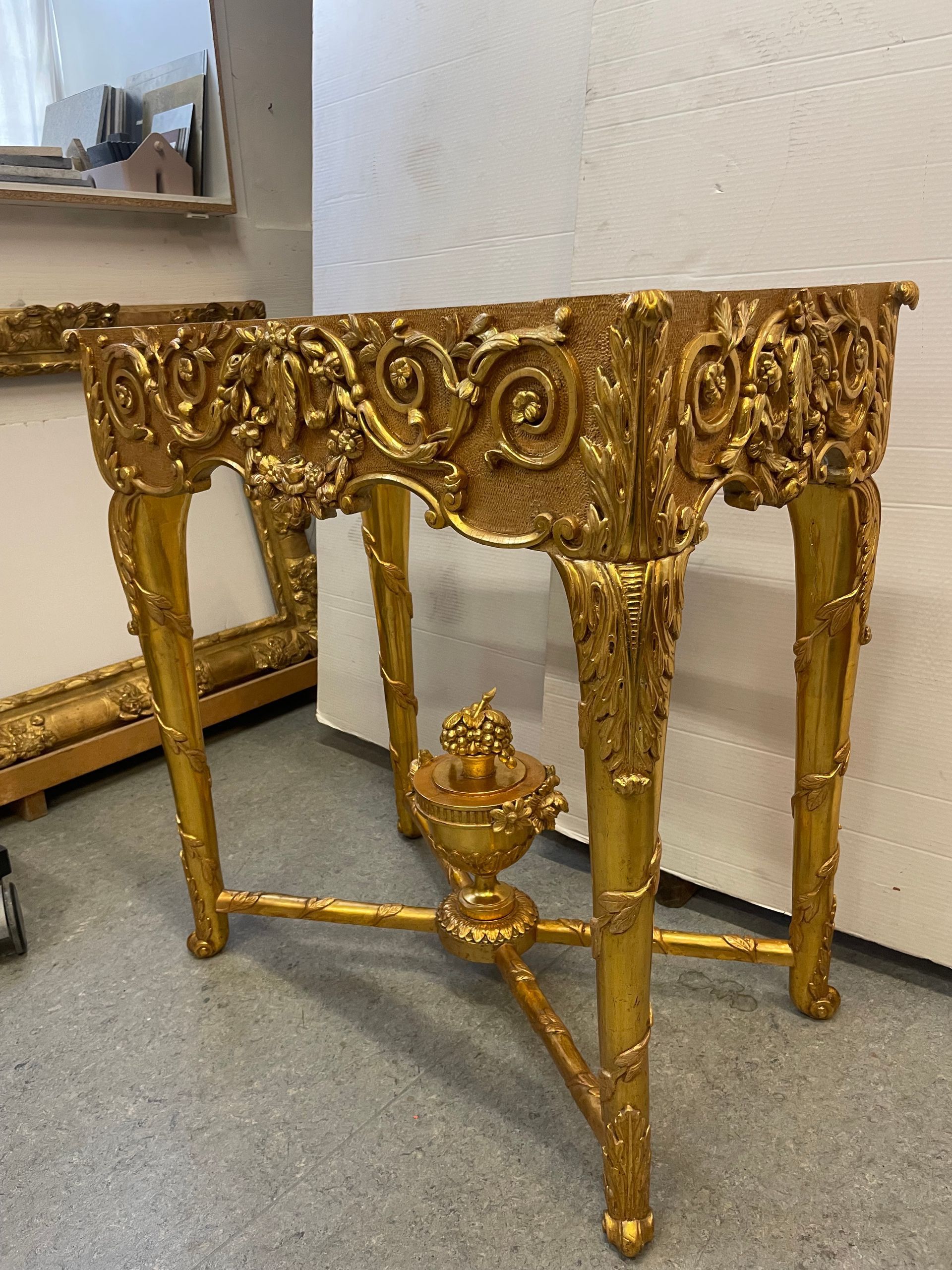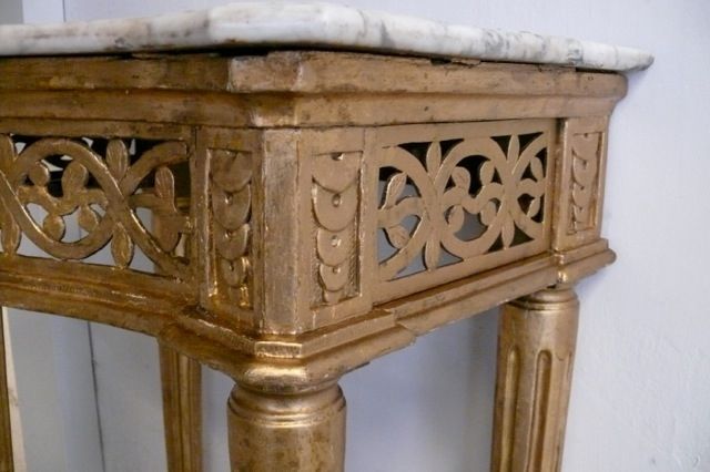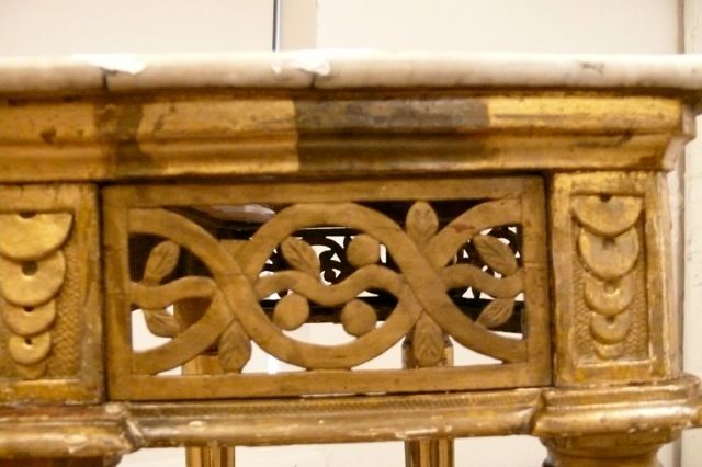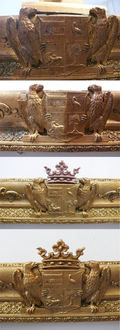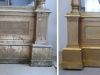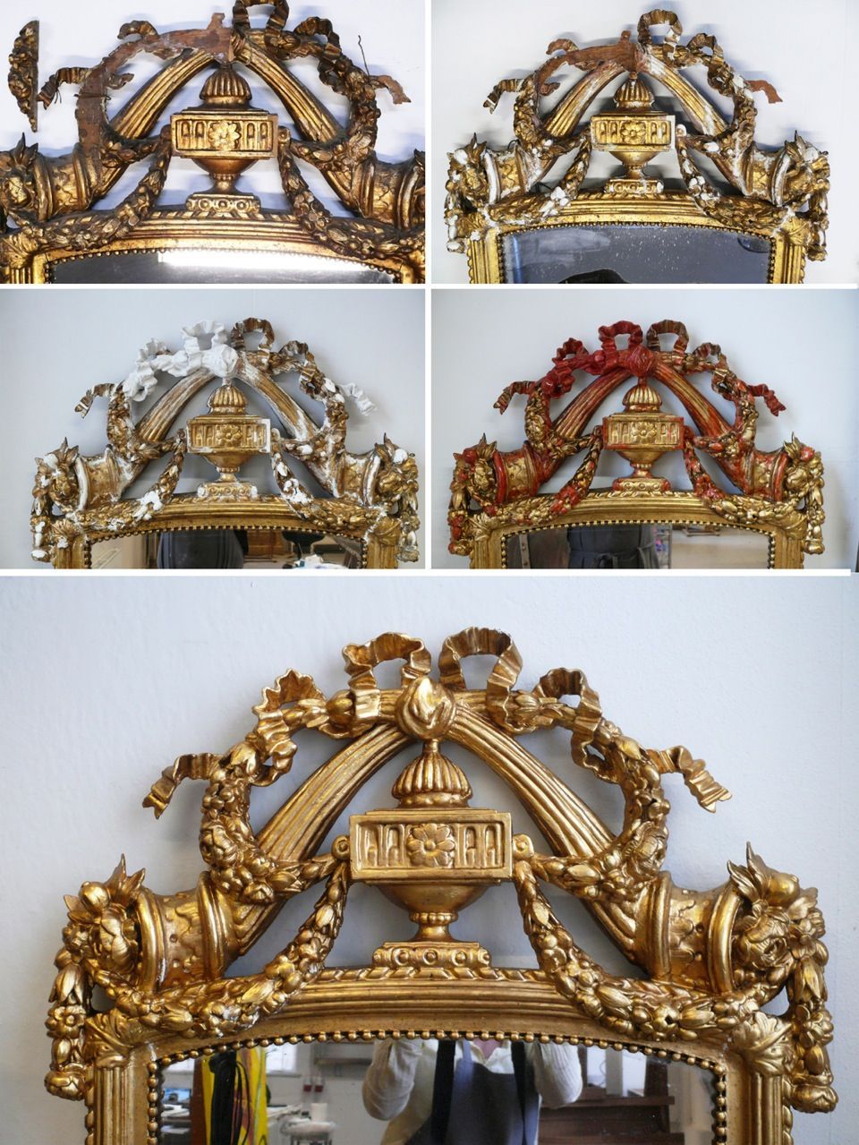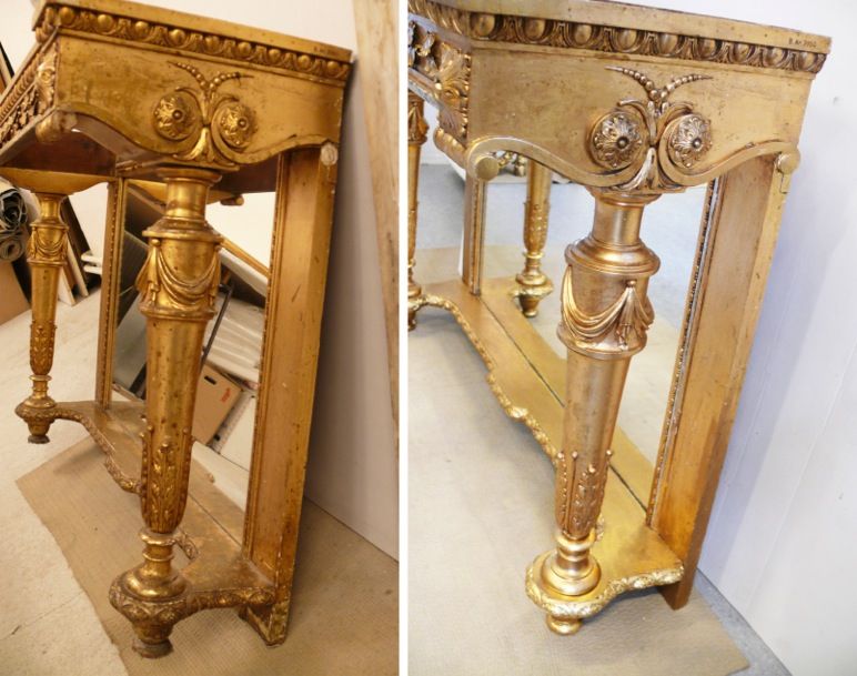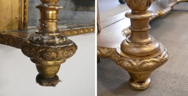 Afstøbning og genopbygning af manglende fragmenter med gips eller kridtgrund. Afslutningsvis nyforgyldning og patinering eller retouchering af de nye fragmenter og/eller reparationer. Dette gælder ligeså ved restaurering af forgyldte spejlrammer og konsoller.