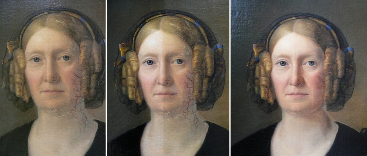 Ved at fjerne overfladesnavsen og den gulnede fernis er det muligt at genskabe kunstnerens oprindelige farvekolorit, farvedybde og farveglans.